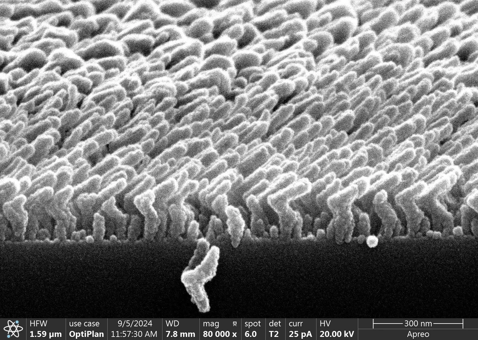 “flooded forest” by Matthew Mulvehill, Conn Center for Renewable Energy Research (uofL). imaging facility: mntc huson lab (uofl). Description: A scanning electron microscope (SEM) image of a forest of titanium dioxide nano-rod coated silicon micro-pillars. The titanium dioxide nano-rods are coated in a thin layer of carbon via sputtering, resulting in a more bloated appearance of the nano-rods. The bases of the pillars are submerged in a polymer that serves as protection for the carbon that lies underneath from plasma etching to clean the tops and sides of the pillars. The cleaned micro-pillars are then used in photo-electrochemistry experiments to learn how well the micro-pillars absorb light and use that energy to drive chemical reactions.
