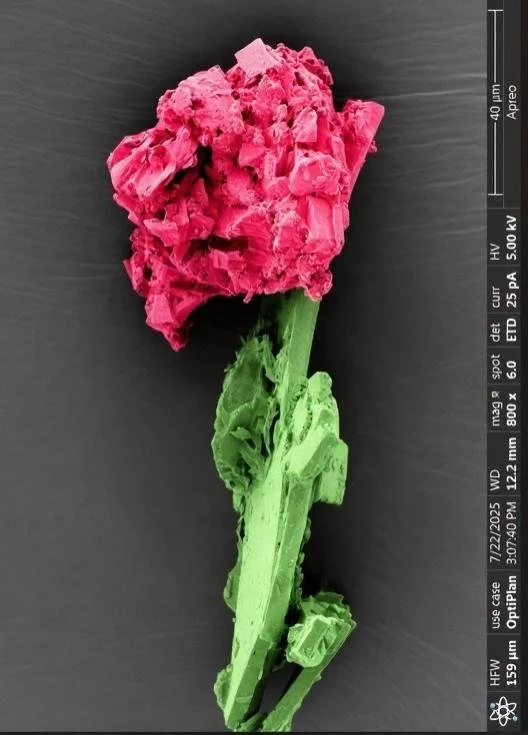 “Nano Rose on a Stem” by Sharmin Akter, university of louisville. imaging facilty: mntc huson lab (uofl). Description: This SEM micrograph, captured at the Micro/Nano Technology Center (MNTC) of the University of Louisville, shows a perovskite powder particle. The sample was prepared as part of the precursor material used for coating the carbon electrode layer in carbon-based perovskite solar cells.
